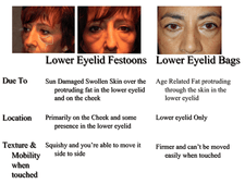 They differ from lower lid bags in a few ways. First involves location. Lower lid Bags form just below the lower lid lashes while festoons and malar mounds form further down on the cheek region. The Second involves etiology. Lower Lid Bags form as a result of age related fat changes around the eyes while festoons and malar mounds result from past sun damage in most cases. Third, lower lid bags when palpated are firm while festoons are squishy.